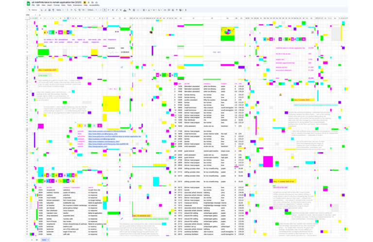 UK Indefinite Leave to Remain Application Fee (2025) is a screen-recorded performance on YouTube that doubles as a live fundraising campaign. In utilising the platform to solicit public donations, Chen reconfigures the familiar interface of a Google Sheet into a site of resilience, meticulously archiving her exhaustive efforts to secure the substantial legal fees required for UK permanent residency. Through accelerated screen recording, she converts the chromatic logic of a colour-coded spreadsheet into a frenetic kinetic animation.