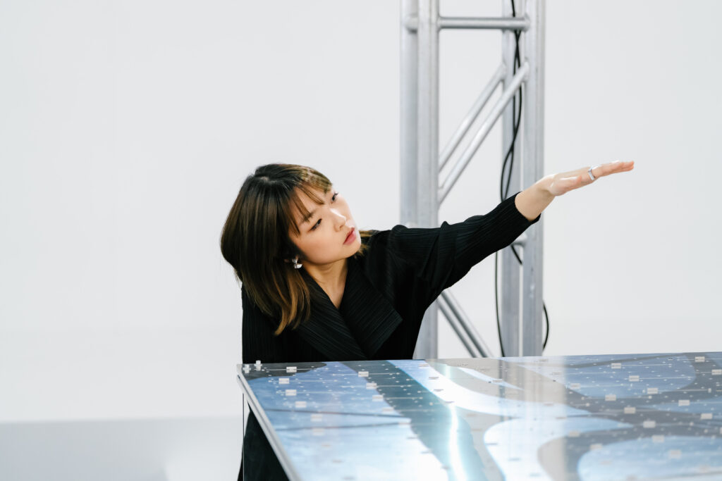 In Shadow Work, Ng integrates live percussion with object manipulation, activating the instrument through rhythmic physicalities. A percussionist’s gestures cast shifting silhouettes onto the sound installation, which in turn trigger multi‑choral electronic responses, generating a continuous feedback loop between physical instrumentation and synthesised sound.
