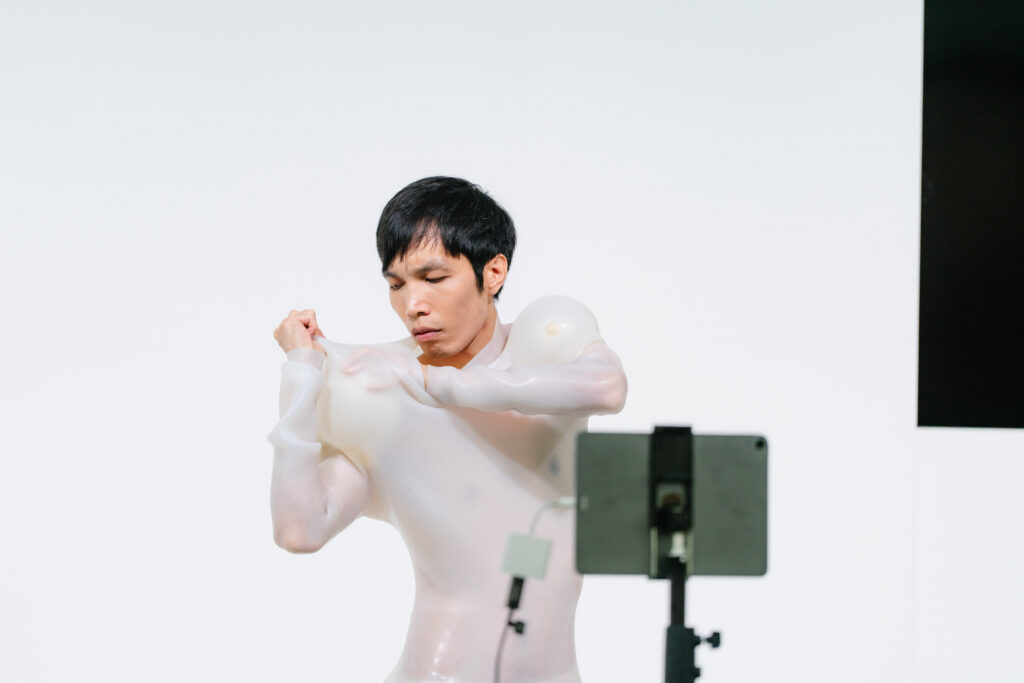 “IYKYK” (if you know you know) is an internet colloquialism signalling content intended only for a specific in‑group. Jiaming Liao’s practice examines how image production in mass media shapes bodily expression and its entanglement with desire. For this performance, Liao dons his signature muscle suit to foreground how beauty and masculinity are culturally defined within an era of intensified commercialisation and technological mediation.