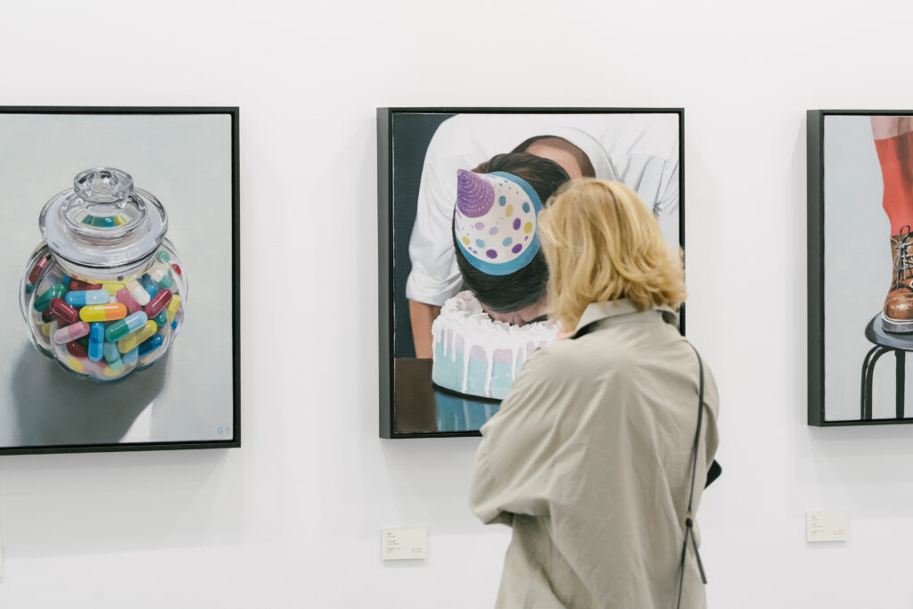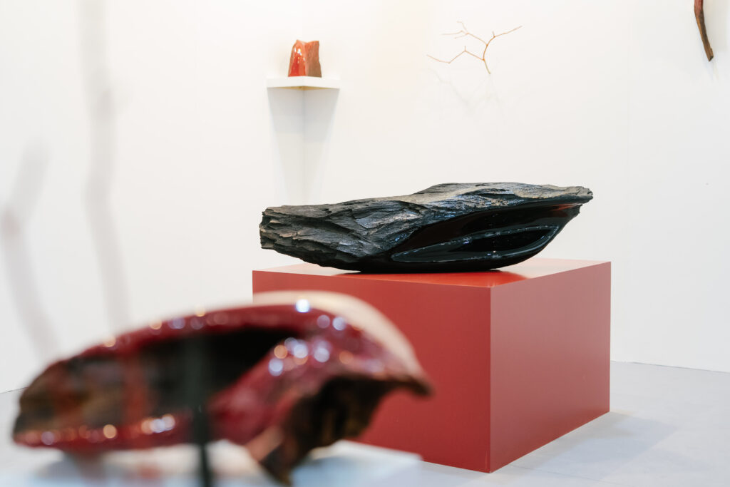 Sujin Lee 的作品懸置於日常生活中的瞬間,如電影定格中封存的複雜情感,邀請觀眾思考人類存在的脆弱性。她的繪畫靜謐而充滿力量,描繪著手指在鍵盤上打字、黑暗背景下的手握著銀製勺子,或是汽車沉入水中的場景,傳遞微妙而強烈的焦慮。她的軟氈雕塑則將具體的形象,如營火或沉入水中的汽車,轉化為細膩而可觸的形式,將不安的心理狀態具象化。